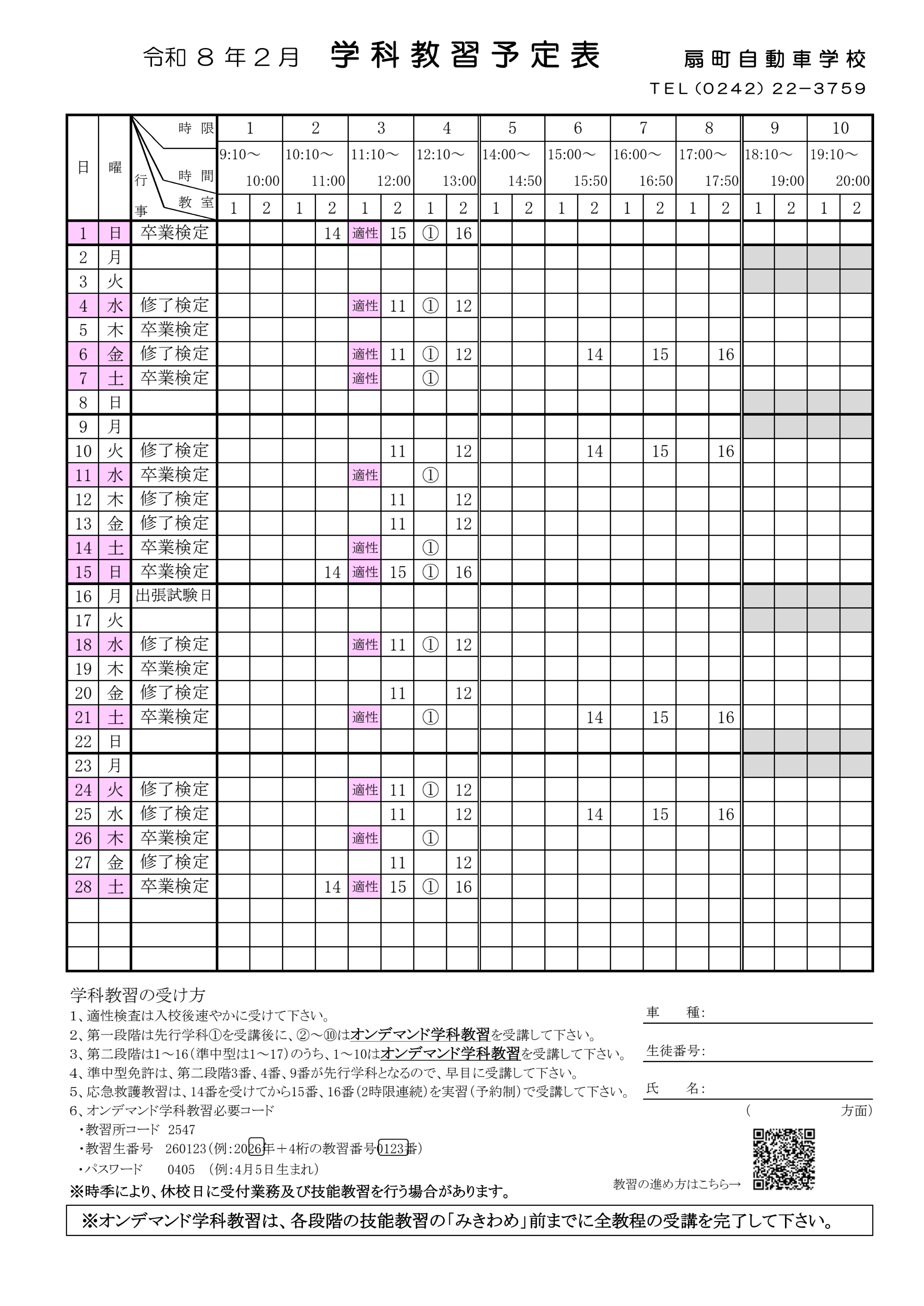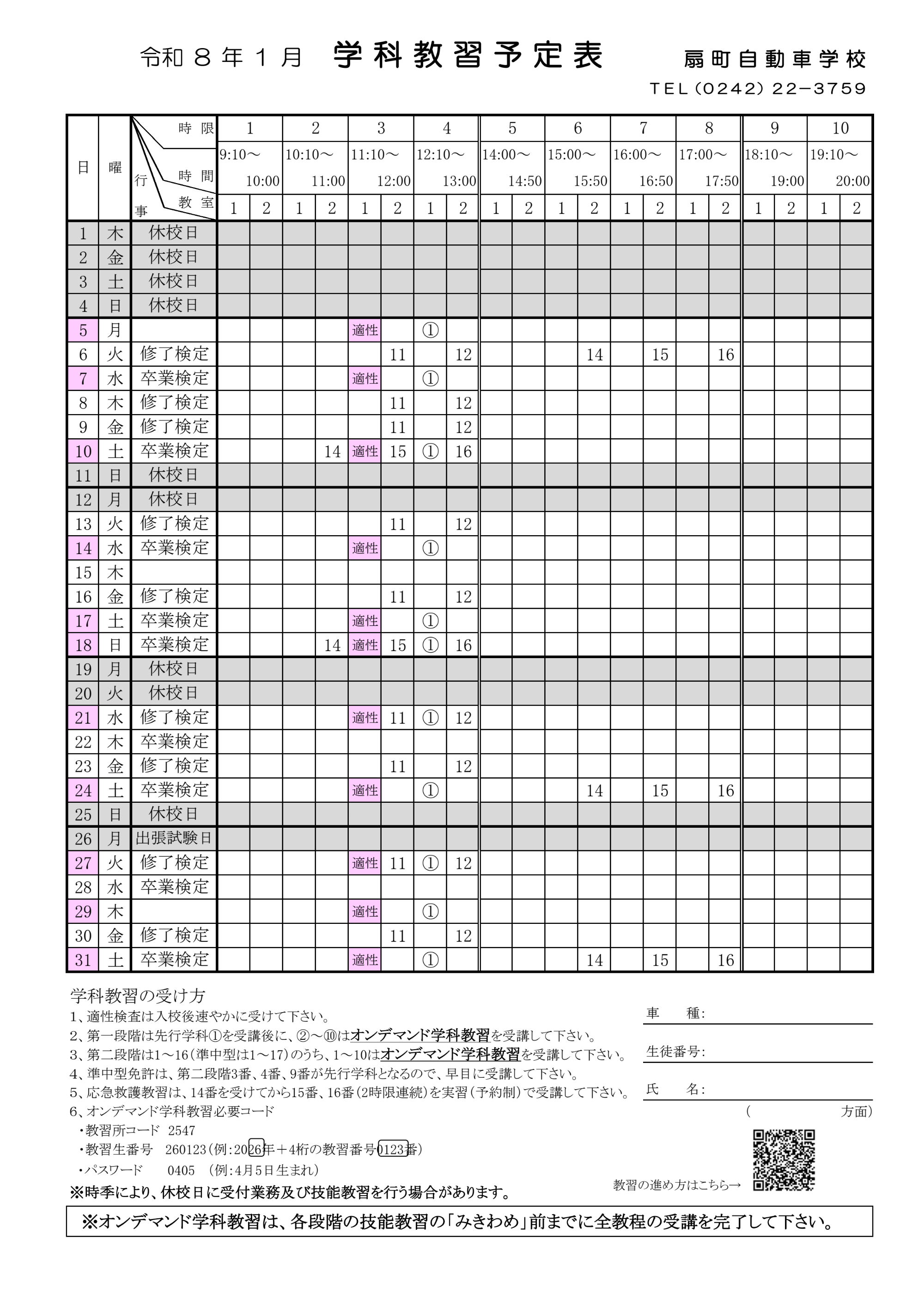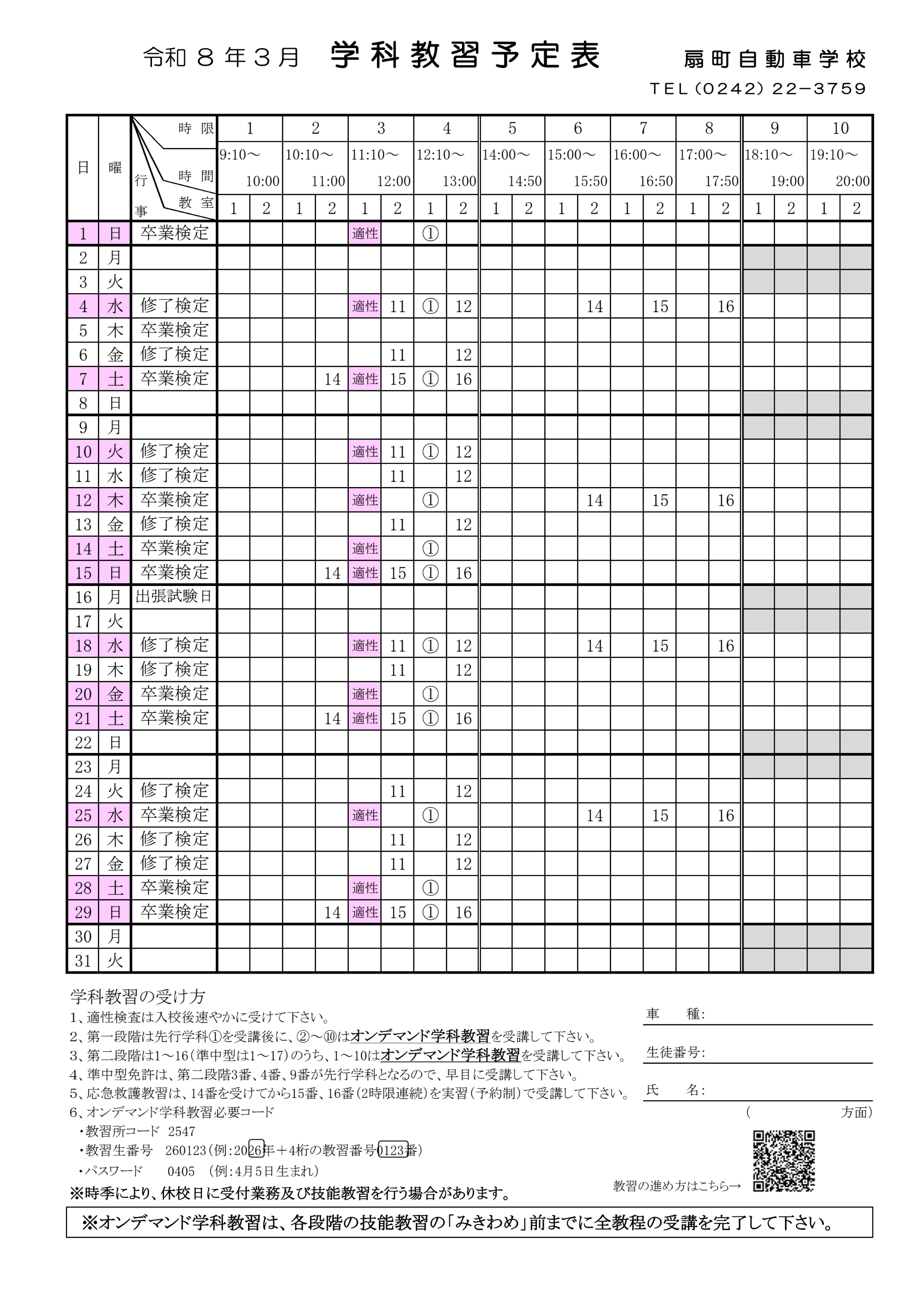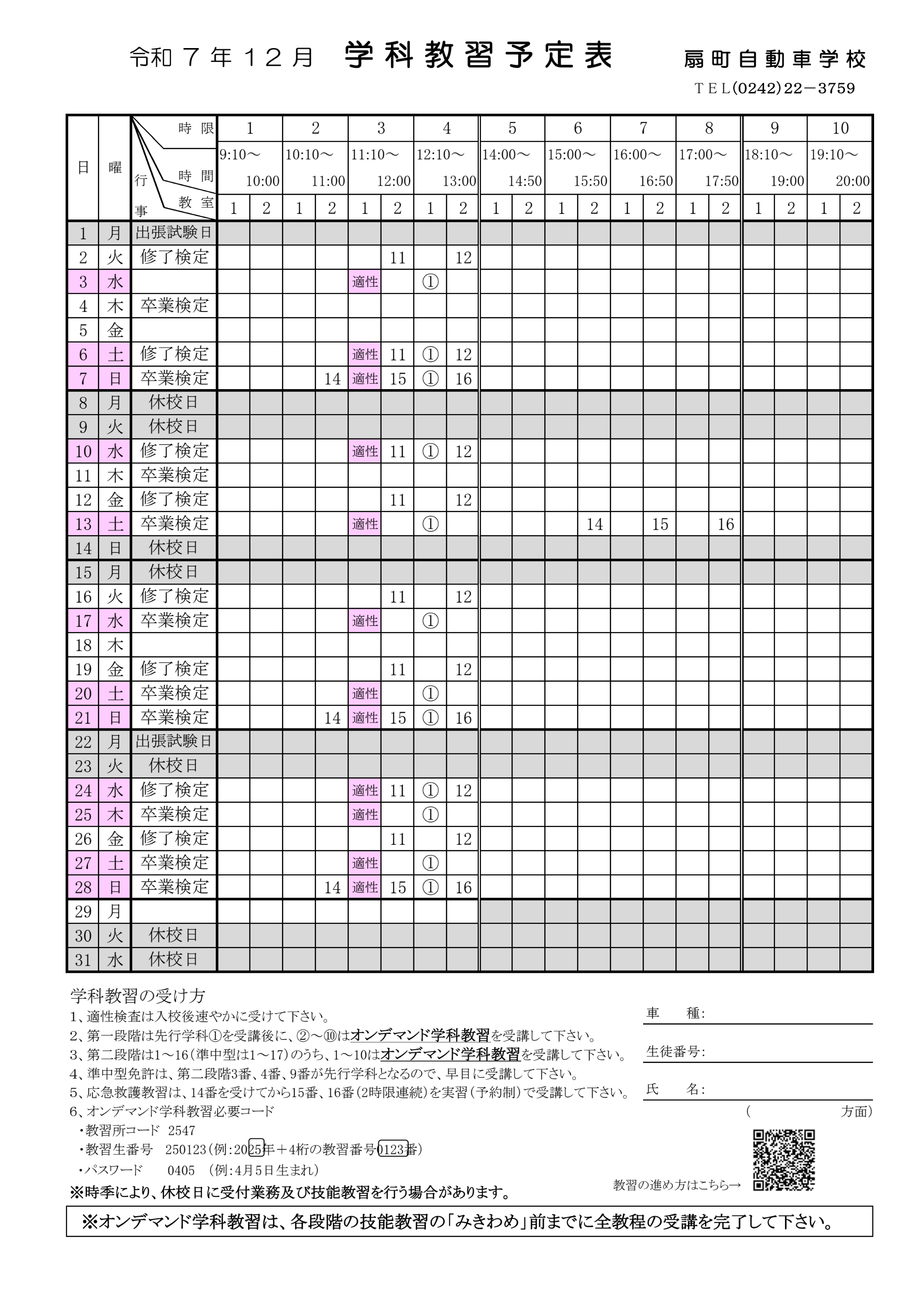 学科11番、12番は対面でのみの開催となります。原簿と手帳をお持ちの上受講をお願いいたします。